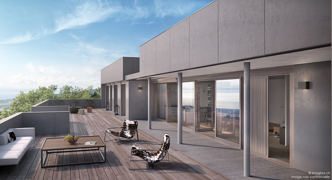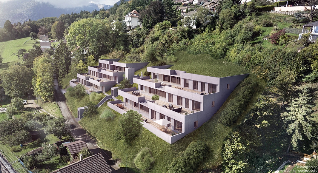 Construction de 6 villas-terrasses, orientées sud/sud-est. Comprenant des surfaces habitables de 165 à 195 m². Terrasses généreuses de 120 m² à 170 m². Parking souterrain de 12 places.