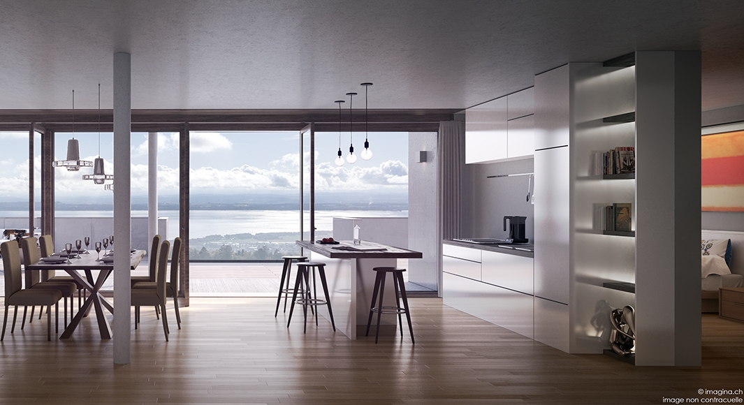 Vue dégagée sur le lac de Neuchâtel et les Alpes bernoises, avec leurs sommets culminant à 4000 mètres.